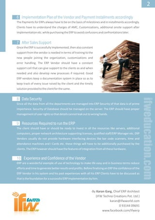 The document discusses important factors to consider when finalizing an ERP system. Key factors include checking the number of previous successful ERP implementations by the vendor, getting feedback from existing clients, ensuring the ERP covers all needed modules, understanding the vendor's future plans and support, assessing implementation costs and timelines, and evaluating the vendor's experience and confidence in their system. Conducting thorough due diligence on these factors is important for a successful ERP selection and implementation.