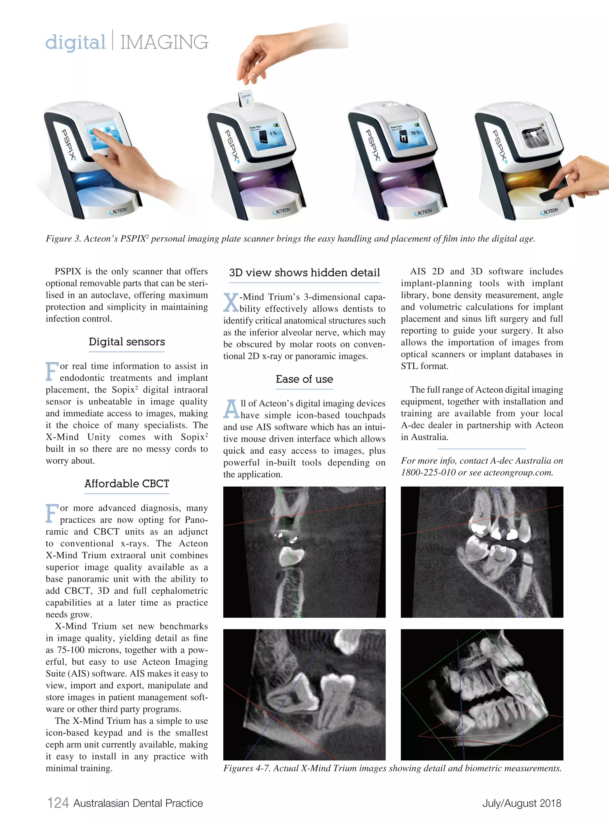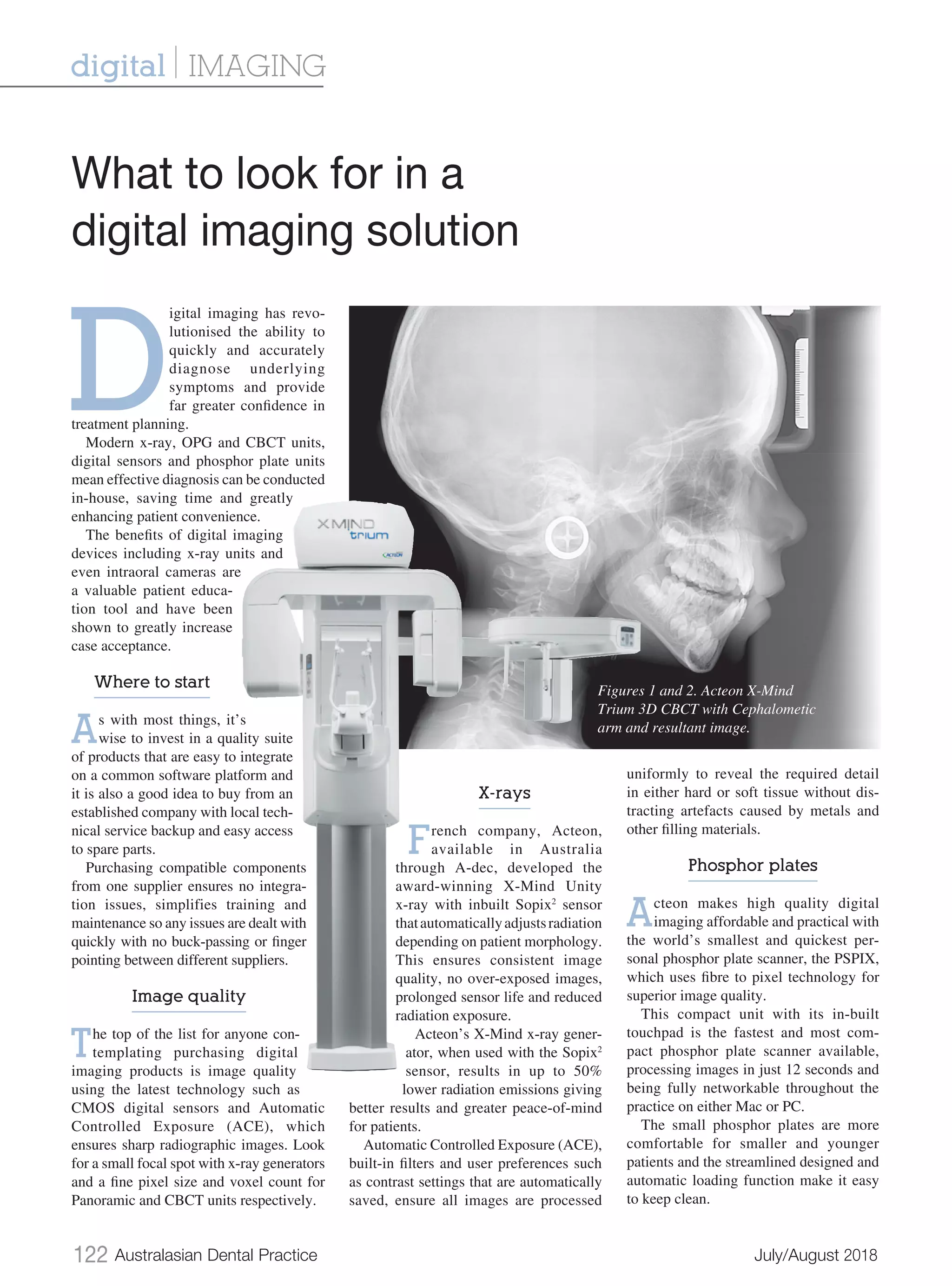 The document discusses the advancements in digital imaging technology in dentistry, highlighting benefits such as improved diagnostic accuracy, patient convenience, and ease of treatment planning. It features specific products like Acteon's x-mind unity and trium units, emphasizing their image quality, reduced radiation exposure, and user-friendly software for effective patient management. The document recommends investing in compatible systems from established suppliers to streamline training and maintenance.