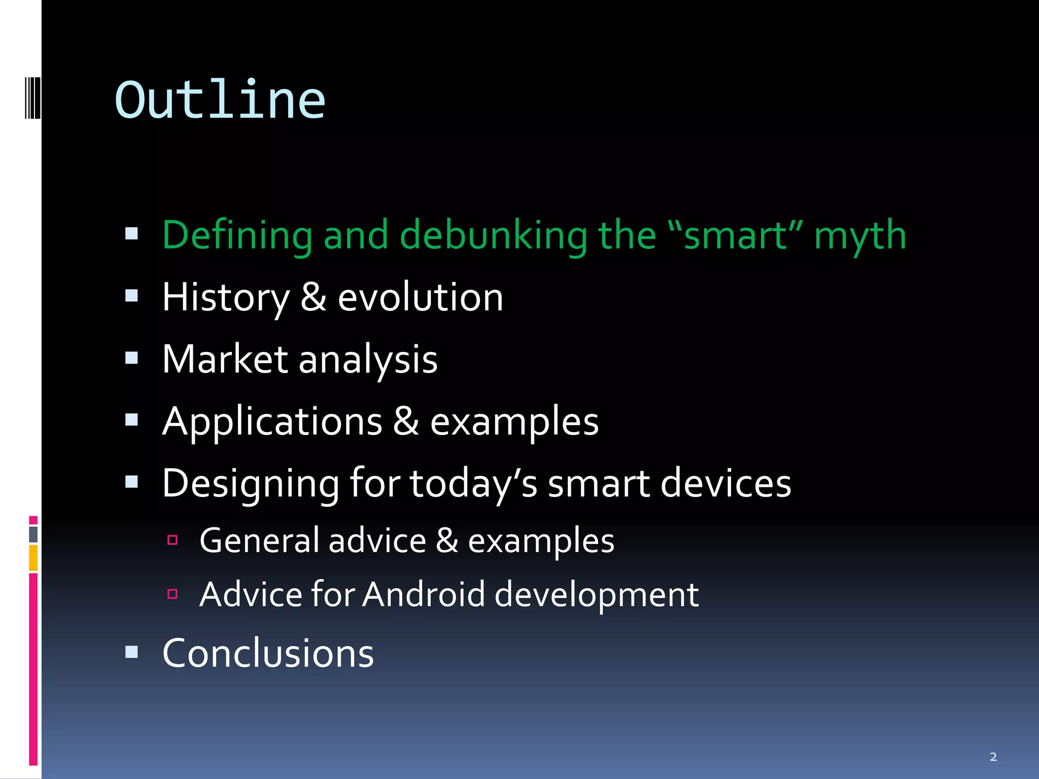 The document discusses smart platforms and provides advice for developing applications for them. It begins by debunking the myth that devices themselves are smart, noting that it is people who are smart. It then covers the history and evolution of smart platforms from early feature phones to today's smartphones and tablets. Market analysis shows smartphones now comprise over 60% of the market. Examples are given of education, health, and AR applications. General design advice includes keeping things simple, clear, and concise. Specific Android development tips include treating each screen as an activity and supporting different resolutions and orientations. In conclusion, smart platforms are powerful if used well but have limitations around resources, adoption, fragmentation, and monetization.