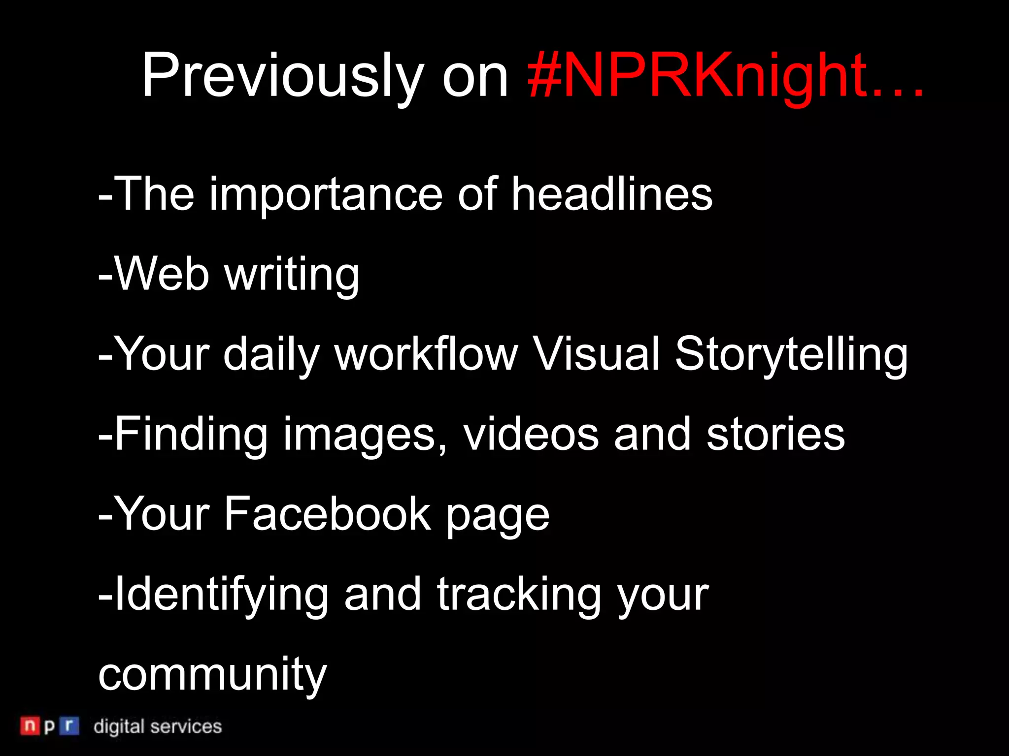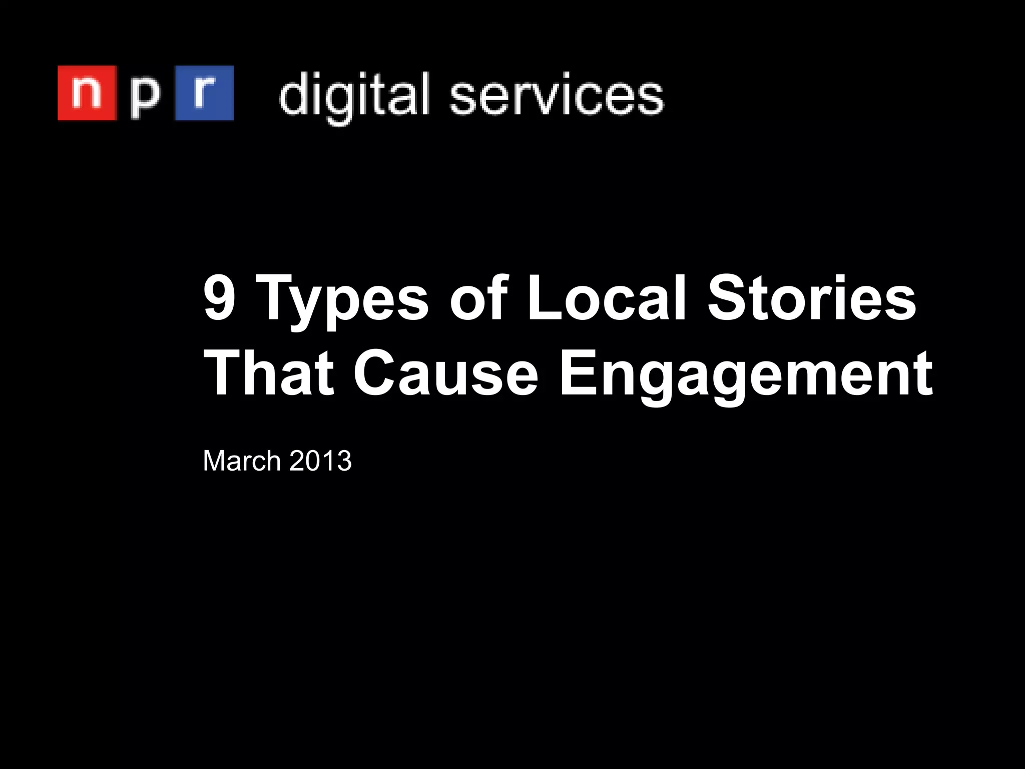 The document describes 9 types of local stories that tend to engage audiences on social media: place explainers, crowd pleasers, curiosity stimulators, news explainers, major breaking news, feel-good smilers, topical buzzers, provocative controversies, and awe-inspiring visuals. It provides examples of each type of story and the social media engagement metrics they received. The document encourages identifying real local stories that could fit one of the 9 types and writing a headline for social media assignment.