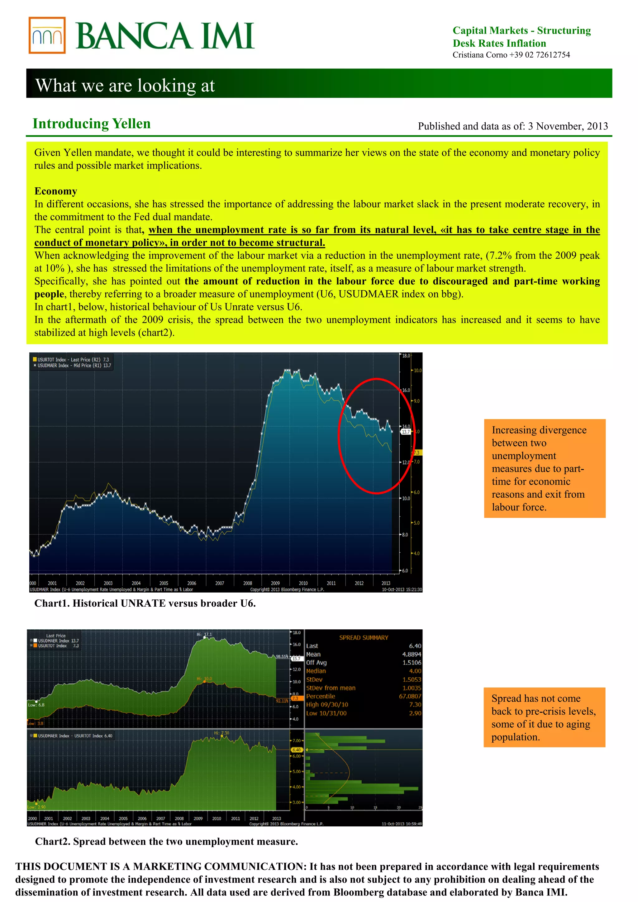 Yellen stresses the importance of addressing high prolonged unemployment to prevent it from becoming structural. She judges the strength of the labor market using multiple indicators including the U6 unemployment rate, the gap between actual and estimated NAIRU rates, and measures of job availability and quits. Yellen supports an "optimal control" monetary policy rule that aims to minimize unemployment and inflation gaps, prescribing lower rates when output gaps are wide. She expects the Fed will follow a balanced monetary policy approach once unemployment falls to around 6.5%, likely in 2014-2015.
