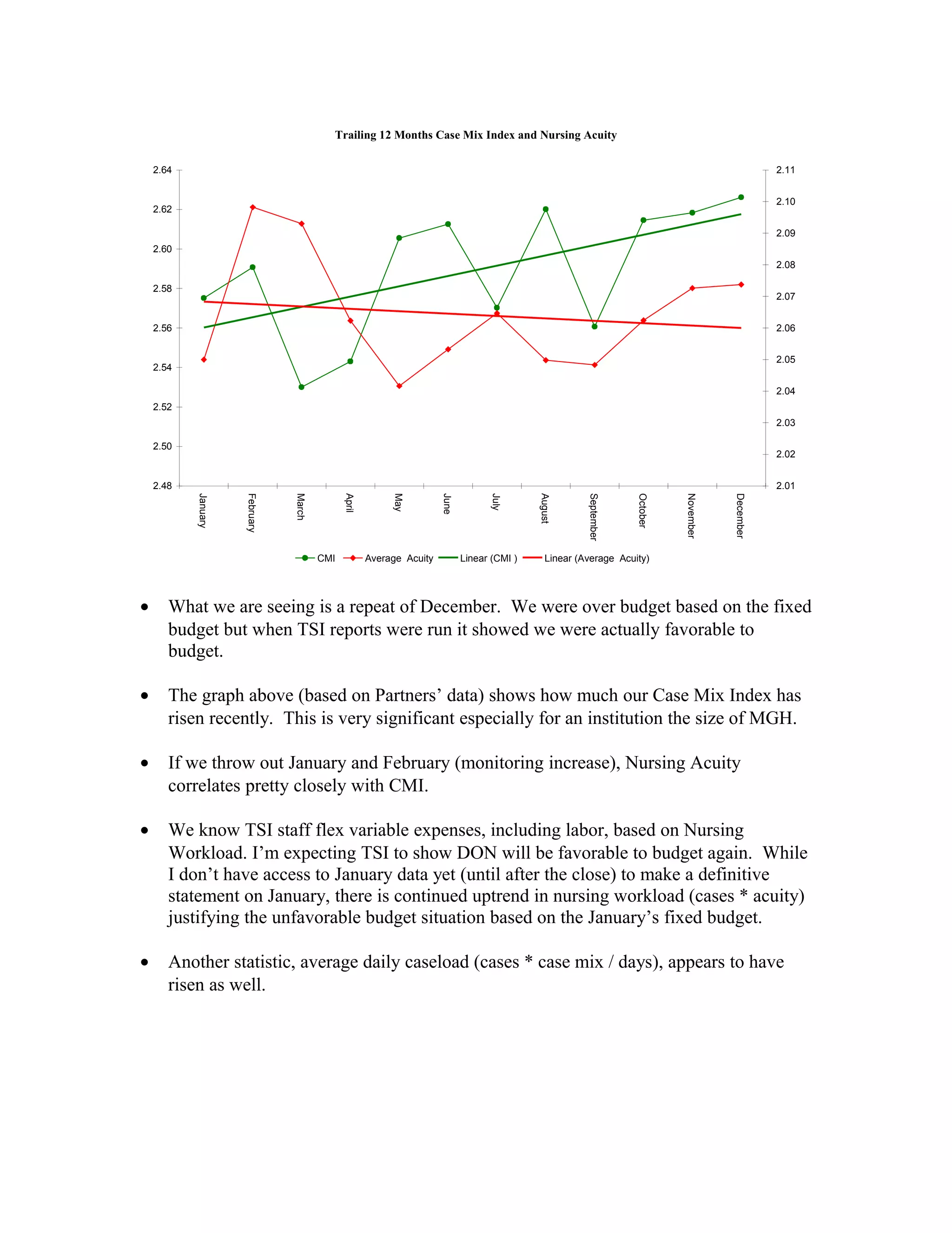 This document discusses trends in case mix index (CMI) and nursing acuity at a hospital from January to December. The CMI and average nursing acuity have risen significantly over this period, especially for a large institution. If January and February are excluded, nursing acuity correlates closely with CMI. While the budget was exceeded in December based on the fixed budget, the actual performance was favorable when adjusted for increased workload and acuity levels. A continued rise in nursing workload is expected to show the department of nursing was also favorable to budget in January despite the initial unfavorable appearance.