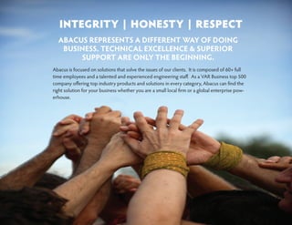 Abacus LLC is an IT solutions provider that focuses on simplifying IT infrastructure and providing superior support. It has over 60 employees and offers a range of services including virtualization, business continuity, disaster recovery, storage, networking, and security. Abacus takes a strategic advisory approach and believes in offering simple, cost-effective solutions tailored to each client's needs and objectives.