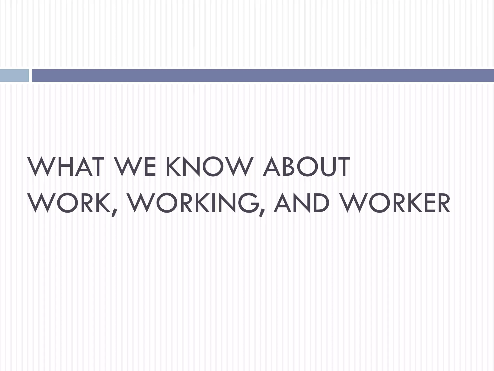 This document discusses different perspectives on work, working, and workers. It covers: