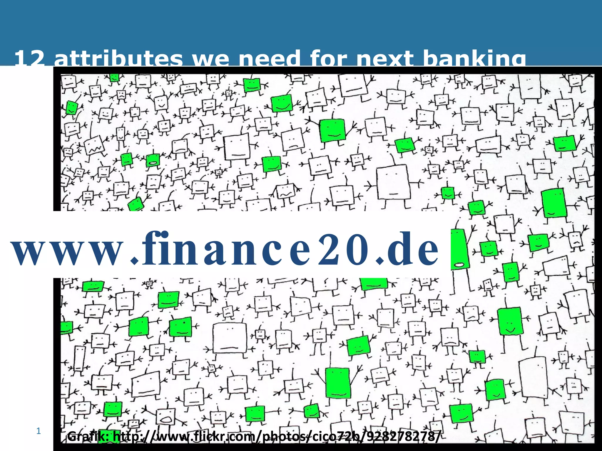 The document outlines 12 essential attributes needed for the future of banking, including respect, passion, empathy, transparency, courage, honesty, authenticity, openness, humility, intelligence, faith, and humanity. It encourages discussion and sharing of ideas related to these attributes on various platforms. Additionally, links to related websites and social media profiles are provided for further engagement.