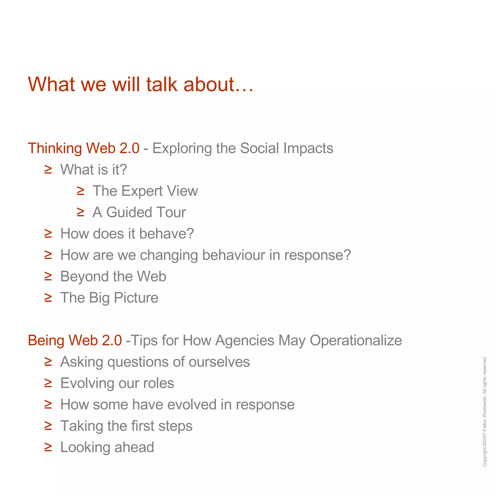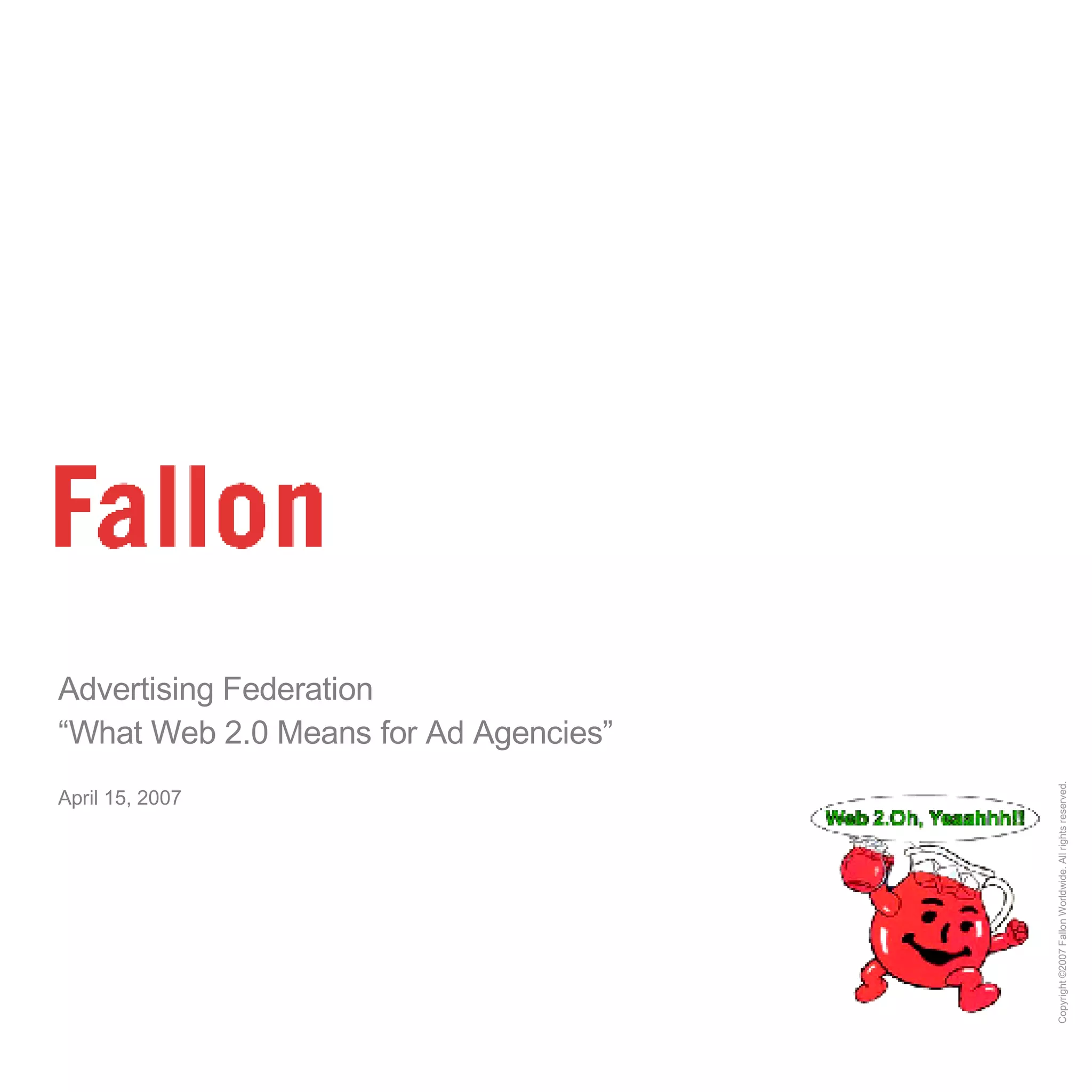 The document discusses how Web 2.0 is changing advertising agencies and the roles they need to take on. It outlines that Web 2.0 allows for more participation, collaboration, and two-way conversations. Agencies need to provide both entertainment and utility value to users, and adopt roles like collaborators, journalists, listeners and brand stewards to fuel engagement within Web 2.0 spaces and people's lives. The future of advertising relies on the value it can provide through more integrated and people-centric approaches.