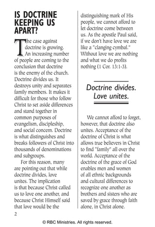 The document discusses ten key Christian doctrines: God, Christ, the Holy Spirit, the Bible, salvation, Christian living, the church, family, the spirit world, and the future. It provides questions and answers about the nature and significance of each doctrine. For example, it explains that Jesus Christ was fully God and fully man, that he died on the cross to atone for humanity's sins, and that he ascended to heaven and will return again. The document aims to outline foundational theological beliefs and their importance.