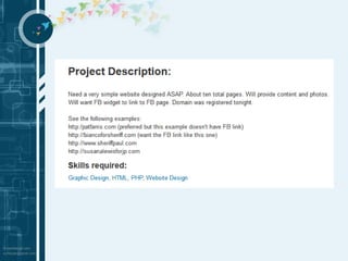 This document provides an overview of freelancing, covering what it is, when to start, and how to get started, alongside its pros and cons. It emphasizes the importance of building a personal portfolio, communication skills, and client management in sustaining a freelancing career. Additionally, it shares tips on writing successful project proposals and lists various platforms for finding freelance work.
