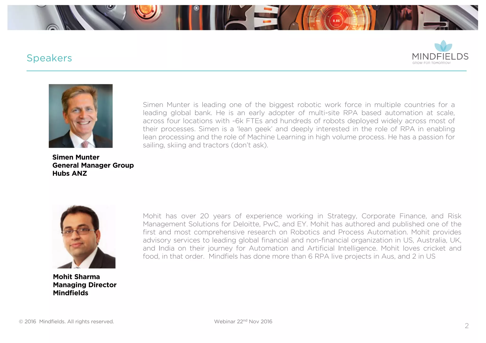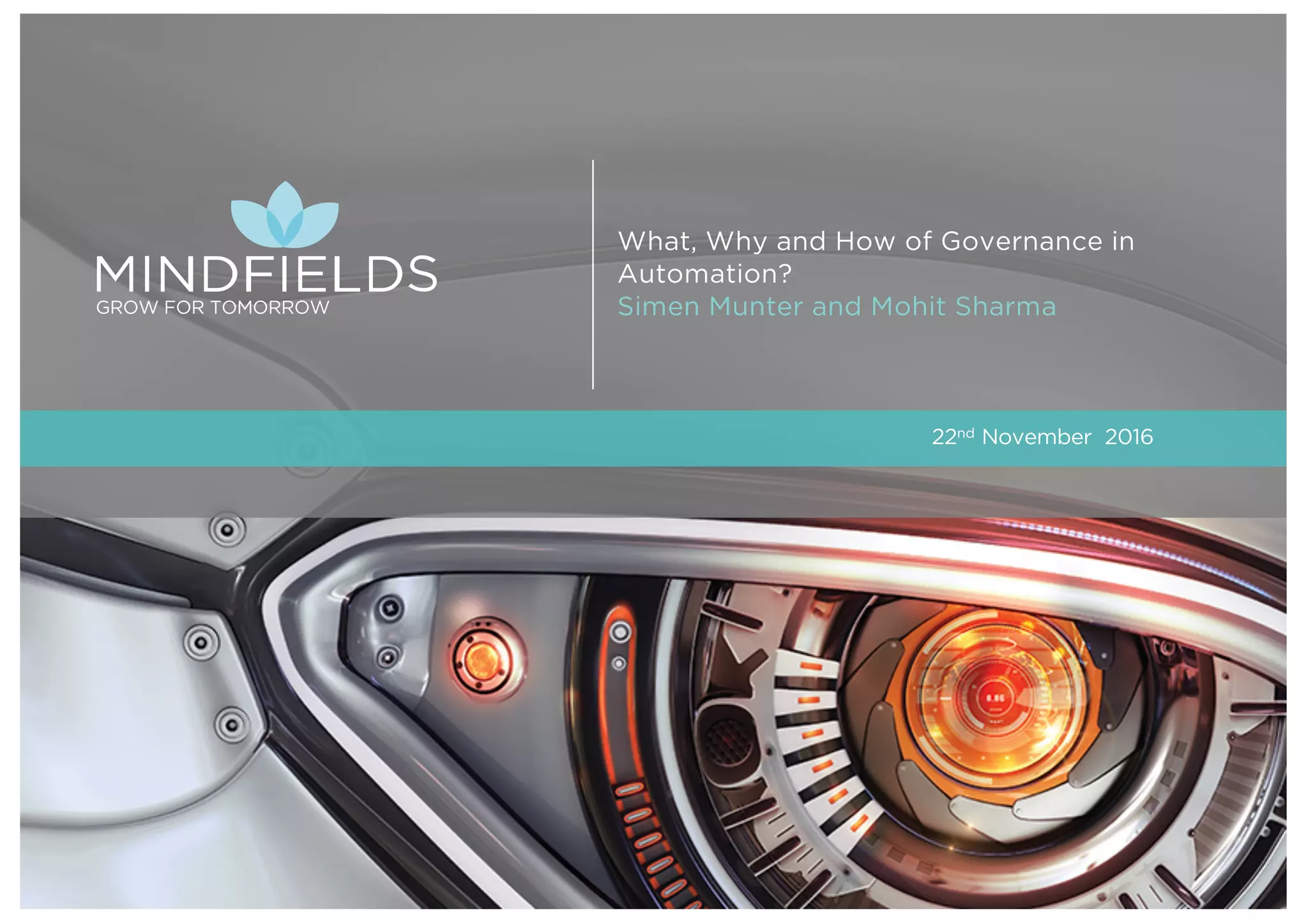 Simen Munter leads one of the largest robotic workforces for a global bank across four locations. Mohit Sharma has over 20 years of experience in strategy, finance, and risk management and has authored research on robotics process automation (RPA). The document discusses the importance of governance in automation, including aligning deployments with enterprise strategy, defining technology platforms and development patterns, and installing the right people. It provides examples of key elements of governance like access controls, change management policies, and operational risk impact assessments. Common myths about risks of RPA are also debunked.