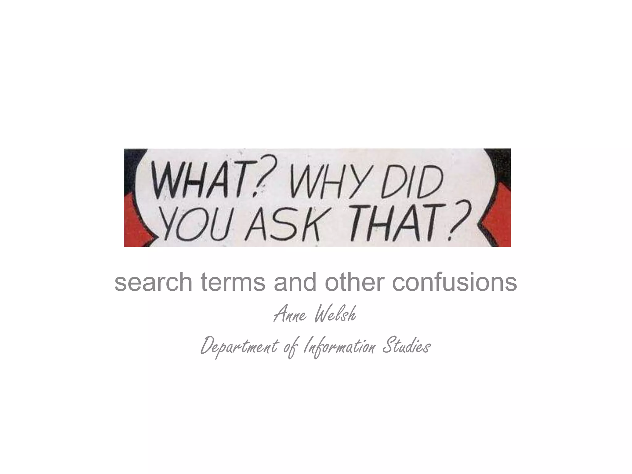 ![WHAT THE LIBRARIAN SAWCONTROLLING THE [SEARCH] VOCABULARY](https://image.slidesharecdn.com/annewelsh-091029021536-phpapp02/75/What-Why-did-you-ask-that-search-terms-and-other-confusions-7-2048.jpg)