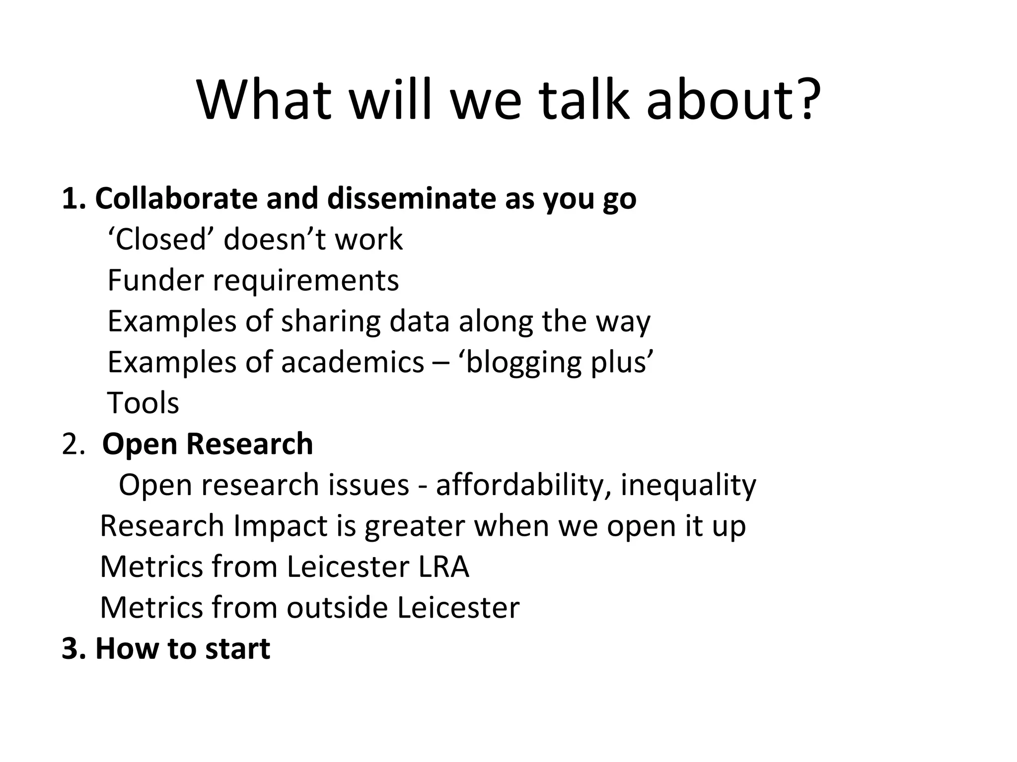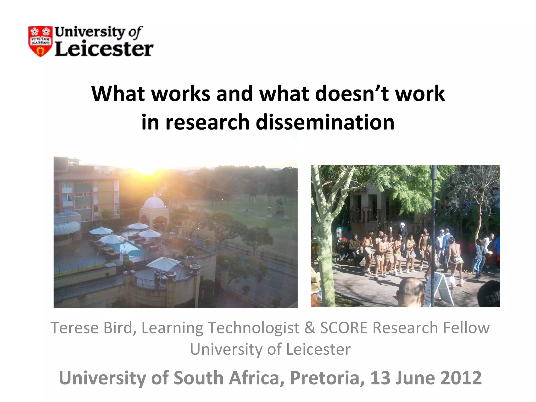 This document discusses effective strategies for disseminating research findings. It argues that keeping research "closed" is ineffective and that funders now require sharing results as the research progresses. Some effective dissemination strategies mentioned include maintaining a project website, blogging to share work in progress, and using tools like Twitter and SlideShare to engage others. Open access to research is also discussed as increasing impact and affordability. Overall, the document encourages collaborating and sharing research openly and continuously in order to maximize its benefits and influence.