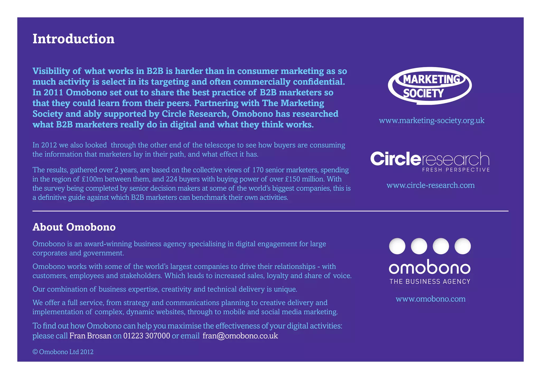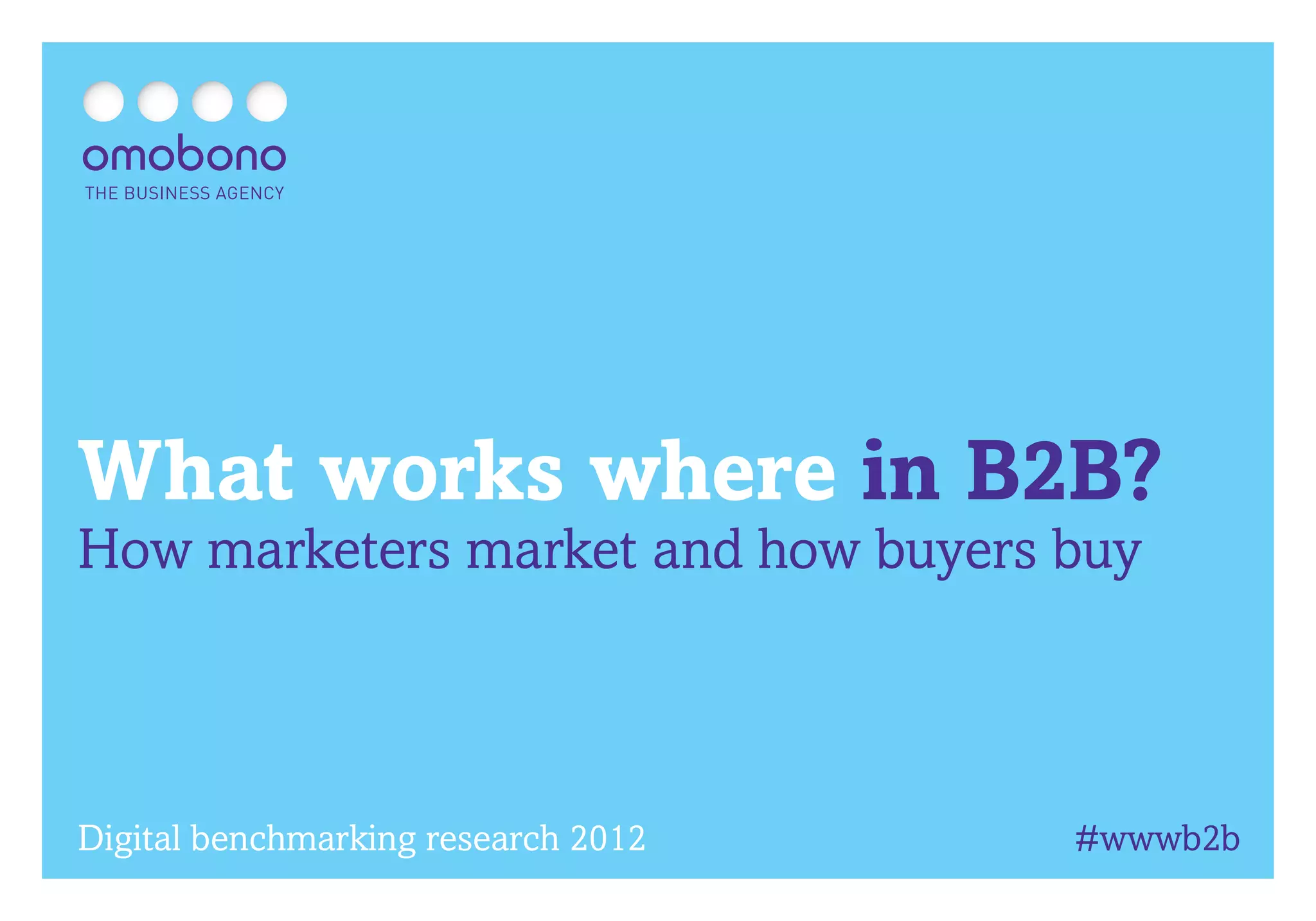 The document presents findings from a 2012 study by Omobono, in partnership with the Marketing Society, examining B2B marketing practices and buyer behavior based on the insights of 170 senior marketers and 224 buyers. It details the allocation of digital marketing budgets, effectiveness of various channels, and highlights the challenges faced by marketers in the B2B sector. Key insights reveal that while digital marketing remains critical, there are gaps between budget allocation and perceived effectiveness of specific marketing activities.