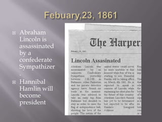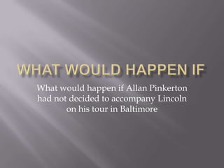 If Allan Pinkerton had not accompanied Lincoln to Baltimore, Lincoln would have been assassinated and Hannibal Hamlin would have become president. With Hamlin as president, the Confederacy would have gained independence and allied with Great Britain and Canada, allowing slavery to continue. Hamlin would not have been re-elected, weakening the Republican party. The US would not have felt powerful enough to expand internationally or get involved in World Wars while bordering the Confederacy. This would have prevented the US from becoming a global economic power in the early 20th century. By the 2000s, the US would be a smaller industrial nation bordered by the Confederacy and Canada, with less international trade and influence.