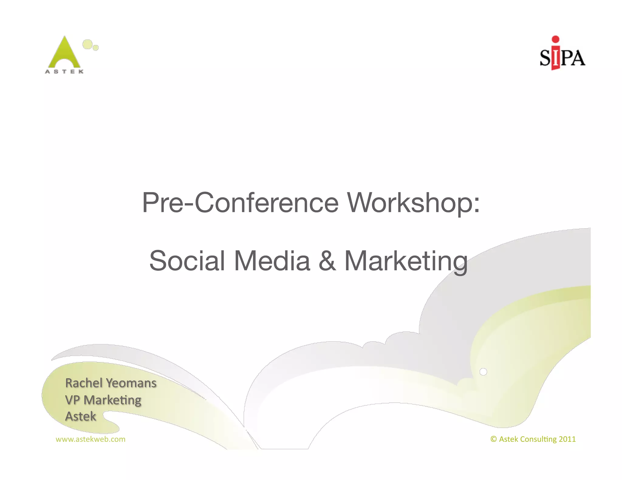 This document serves as a guide for a pre-conference workshop on social media and marketing, outlining best practices, target platforms, and processes for effective social media management. Key topics include goal setting, research on platforms, content organization, and utilizing tools for measurement and analytics. It emphasizes the importance of being authentic and adaptable in social media strategies.
