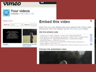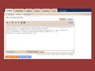 The document discusses the technologies used to create a product and what was learned from the process. It describes using Vimeo and Slideshare to upload videos and powerpoints to blogs, and some difficulties uploading from YouTube. It also discusses using a video camera, tripod, and Pinnacle software to film and edit shots. The document outlines learning to use Blogger to design blogs and embed different media types. It concludes by stating knowledge of the technologies used, like camera, tripod, Pinnacle and websites, has improved.