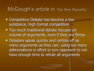 The document discusses competitive debate and how it can be used in the classroom. It notes that traditional competitive debate focuses too much on speed and volume of arguments rather than substance. Lincoln-Douglas and Parliamentary debate formats are presented as better alternatives that emphasize discussing ethical values and adapting to unknown topics. The document also introduces Toulmin's model of argument construction as a useful framework for building logical arguments and illustrates how debate can help develop students' logical thinking and understanding of complex issues.