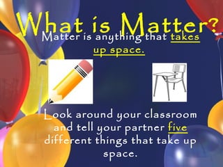 This document discusses the three states of matter: solids, liquids, and gases. It defines each state and provides examples. Solids maintain their shape and size, liquids take the shape of their container, and gases have no definite shape and fill their container. The document also notes that some materials can exist in more than one state of matter, and that matter can change states through processes like melting, freezing, and evaporation. It uses water as an example, pointing out that it can exist as ice (solid), liquid water, or water vapor (gas).