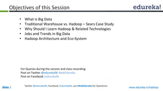 This document is a presentation on big data and Hadoop. It introduces big data, how it is growing exponentially, and the challenges of storing and analyzing unstructured data. It discusses how Sears moved to Hadoop to gain insights from all of its customer data. The presentation explains why Hadoop is in high demand, as it allows distributed processing of large datasets across commodity hardware. It provides an overview of the Hadoop ecosystem including HDFS, MapReduce, Hive, HBase and more. Finally, it discusses job opportunities and salaries in big data which are high and growing significantly.