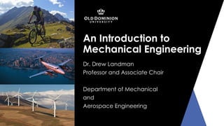 This document provides an introduction to mechanical engineering. It discusses classical definitions of mechanical engineering involving heat, power, and machines. It also discusses how mechanical engineering has evolved to include more modern topics like mechatronics, statistics, and multi-disciplinary fields. Typical jobs for mechanical engineers are also outlined, such as product design, manufacturing, energy production, and systems management. Examples are provided on how mechanical engineers work on wind turbines, nuclear power plants, and measuring aircraft propeller performance to illustrate the breadth of the field.