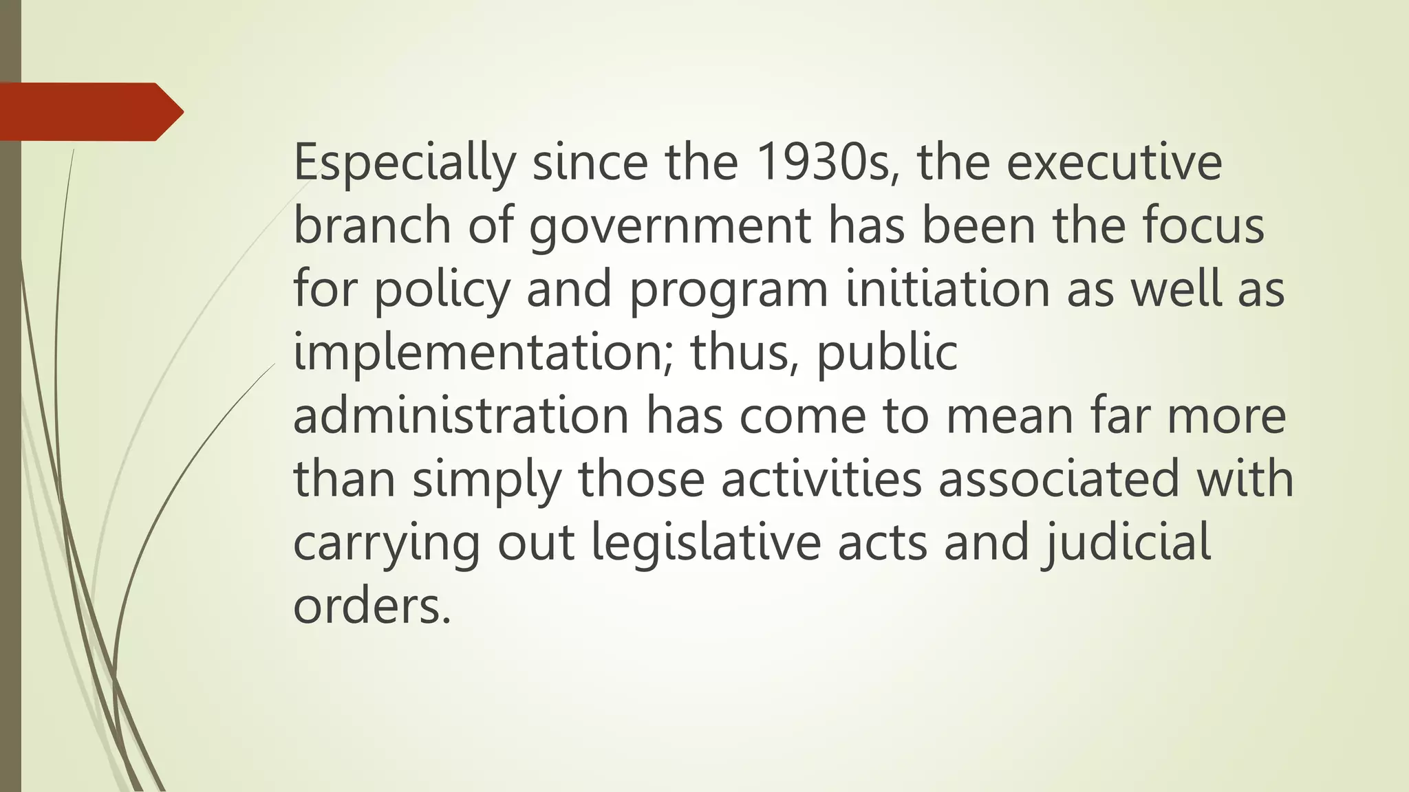 Public administration can be difficult to define as what is public and private varies between societies. It has evolved to encompass more than just carrying out laws, and now involves policy initiation and implementation across all three branches of government. It can be defined as cooperative group effort within a public setting that is involved in policy formulation and differs from private administration due to public oversight. The study of public administration now emphasizes policy analysis and evaluation in recognition of the administrative role in policy development.