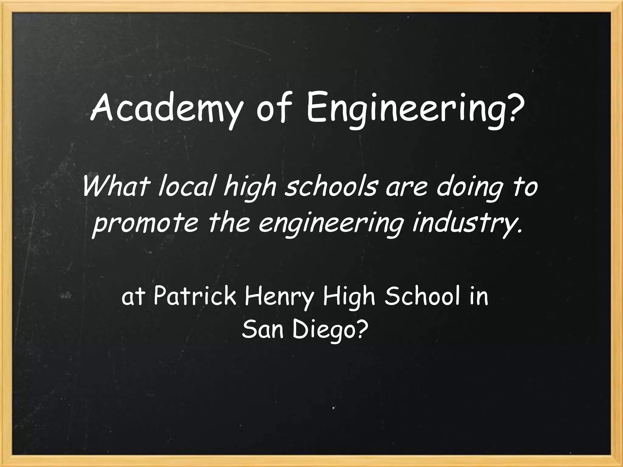 The document discusses the Academy of Engineering program at Patrick Henry High School in San Diego. It aims to educate students in STEM fields and prepare them for engineering careers or college programs. The National Academy Foundation oversees the program and sets guidelines. It includes career-themed curriculum, internships, and partnerships with local businesses. Patrick Henry High has one of the first 13 Academies of Engineering in the country, launched in 2008 with support from organizations like Qualcomm and Verizon.