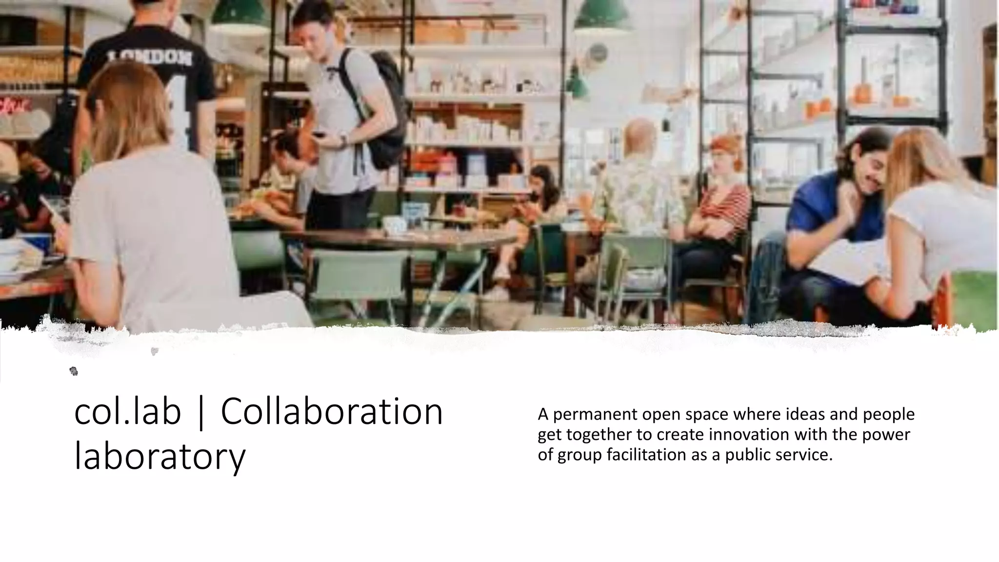 col.lab is a collaboration laboratory aimed at fostering innovation through group facilitation as a public service. It aspires to be a self-sustained entity that engages talented professionals in relevant projects while creating 'living labs' for collaborative learning. The laboratory offers a multidisciplinary approach to public engagement and is open to new social, organizational, and workplace challenges.