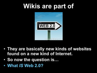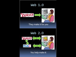 Web 2.0 refers to newer versions of the internet that allow for more collaboration, interaction and sharing between users. Some key aspects of Web 2.0 include user-generated content through blogs, wikis and social media; many-to-many communication that allows information sharing between users; and more interactive experiences through multimedia and user comments. Web 2.0 represents an evolution from the more static, text-based Web 1.0 to a more dynamic web experience driven by user participation.