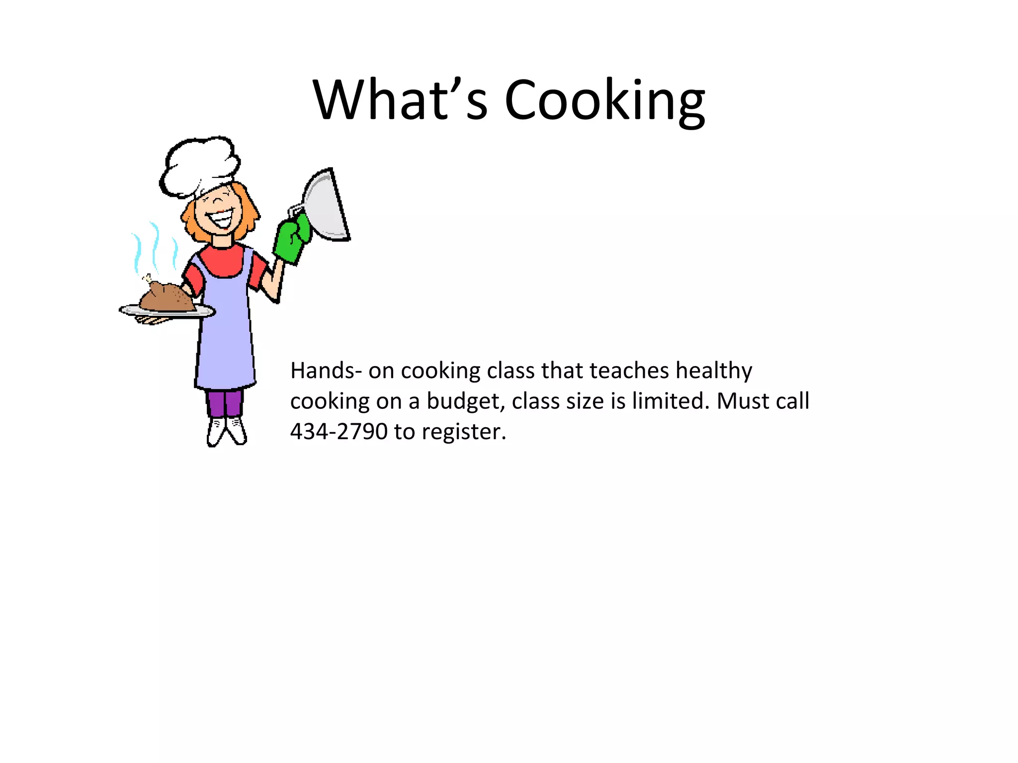 This is a hands-on cooking class that teaches healthy cooking while staying within a budget. The class has a limited size so those interested must call 434-2790 to register for the class. The document provides information about a cooking class including what it teaches, its size limitations, and how to register.
