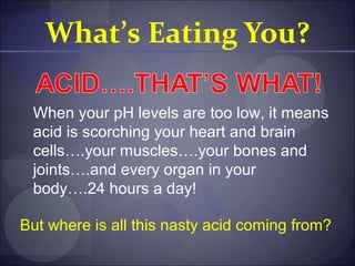 The document discusses how acid levels in the body that are too low can damage cells and organs. It states that acid comes from food, the environment like pollution and chemicals, and the body itself. It recommends drinking alkaline water with a pH of 8.5-9.5 daily to balance the body's pH levels and lists concerns with tap and bottled water along with introducing Nikken's PiMag bottle and filter system as an intelligent alternative that turns tap water alkaline through advanced technology while being independently tested and more affordable than bottled water.