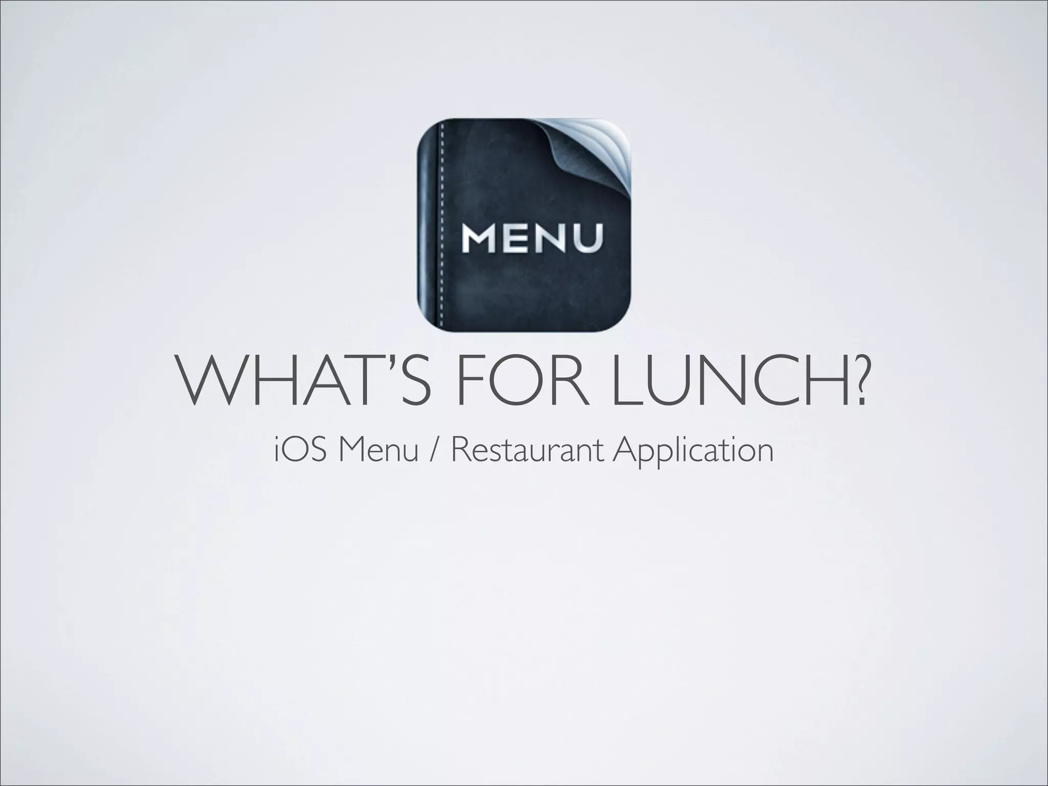 The document outlines the development schedule and concepts for an iOS menu application. It discusses planning app requirements, wireframes, visual design, integrating third-party APIs, testing, and submitting the app. Key phases include composing the look and feel, prototyping, application development, integrating ordering and reservation APIs, and testing the location support. The goal is to quickly enable selection and ordering of food for delivery, carryout, or dining-in from local restaurants.