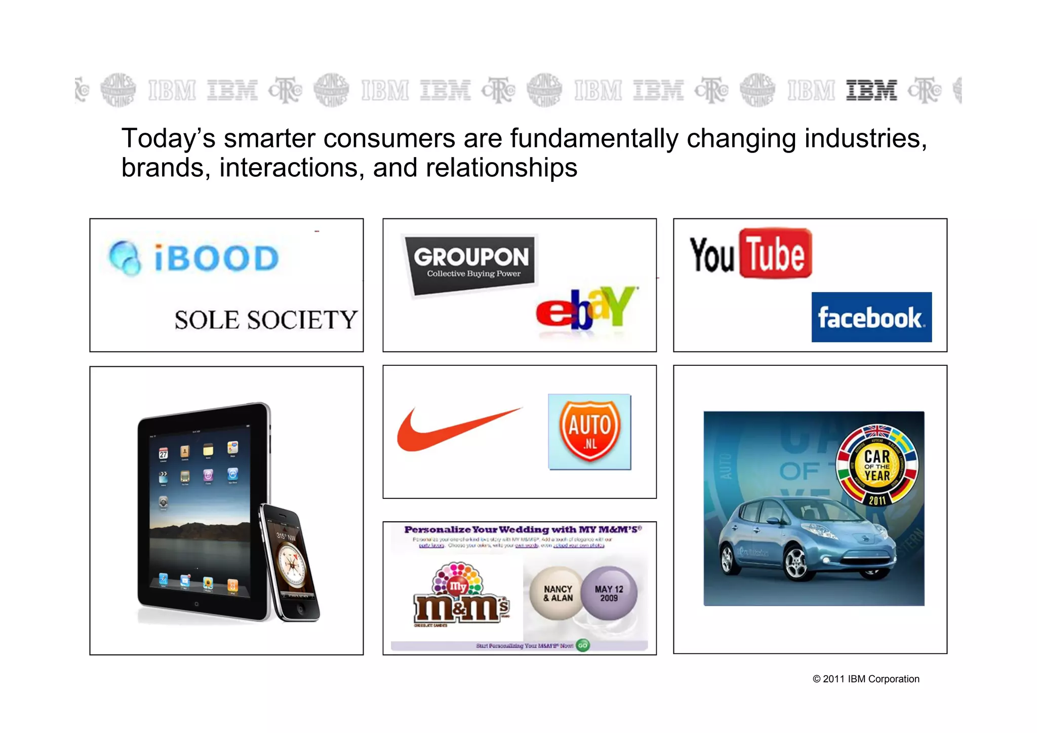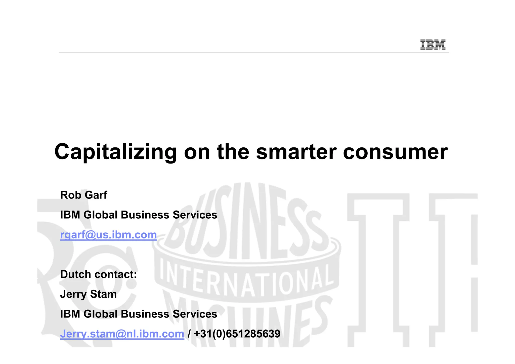 The document discusses how today's consumers are smarter and more technology-savvy. It notes that 662 million people are active on Facebook, 95 million tweets are sent daily, and 5 billion mobile phone connections exist globally. The document then summarizes research by IBM on the profile of smarter consumers, noting that they are more instrumented, interconnected, and intelligent. It provides data on how Dutch consumers compare to European peers in their use of technology and their influences, attitudes, and expectations around shopping and retailers. The key expectations are for retailers to know customers, serve them with convenience and personalization, listen to their voices including via social media, and empower them.