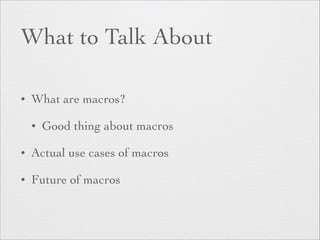 The document discusses Scala macros, highlighting their definition as code that generates code and their ease of use despite the complexity of development. It provides practical examples of using macros in logging and matcher generation, as well as distinctions between blackbox and whitebox macro implementations. Additionally, it mentions the upcoming Scala.meta API aimed at simplifying metaprogramming and enhancing macro capabilities.