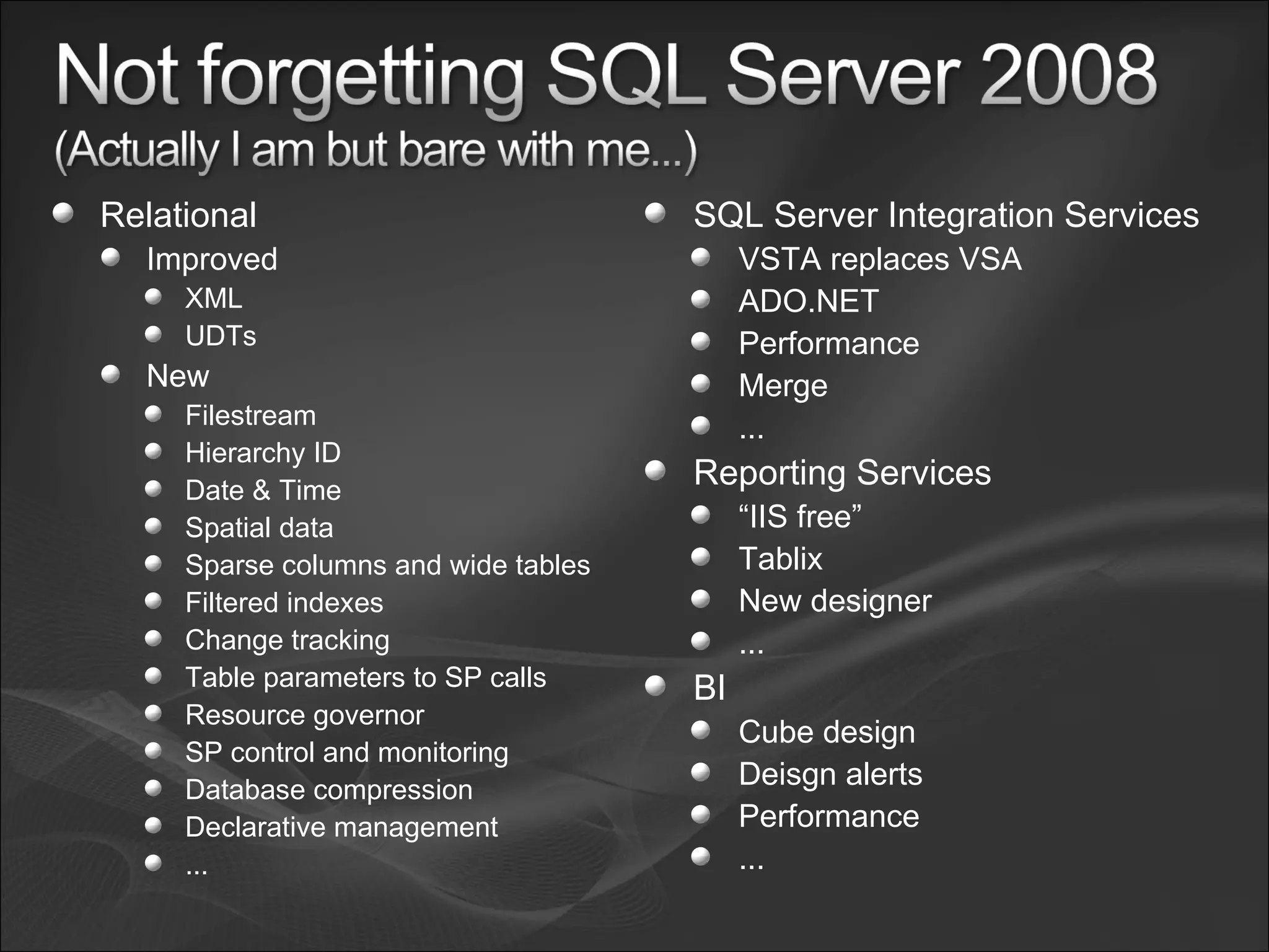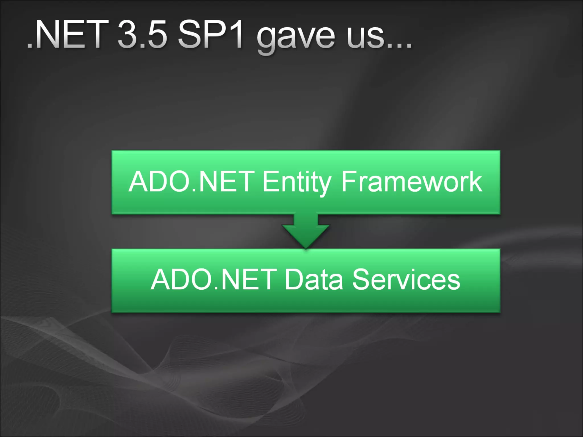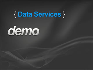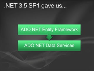 - ADO.NET Data Services which exposes data and methods through RESTful web services using OData protocols and supports various data sources.