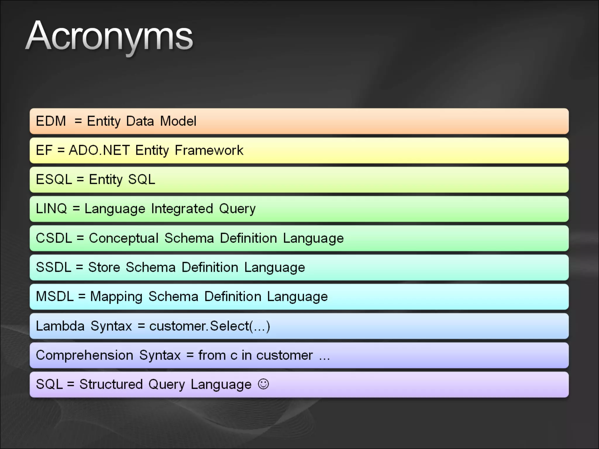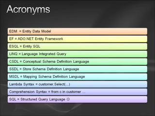 - Differences between LINQ to SQL and LINQ to Entities where the latter supports more capabilities but both allow querying data with LINQ.