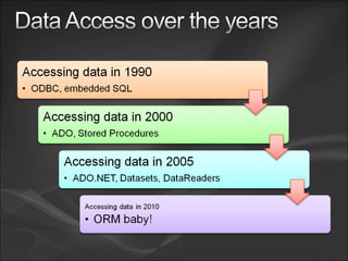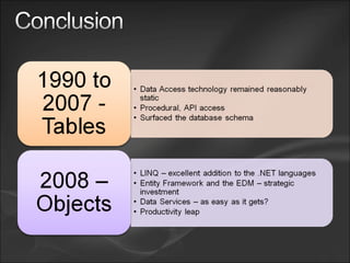 The document discusses various Microsoft technologies for working with data including: