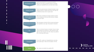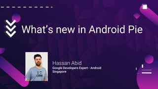The document outlines new features in Android 9 Pie, presented by Hassan Abid, a Google Developers Expert in Android. Key highlights include improvements in indoor positioning with Wi-Fi RTT, enhanced notification capabilities, multi-camera support, and the introduction of the ImageDecoder class for better image handling. Overall, the SDK introduces Kotlin-friendly development practices and new functionalities focusing on user experience and accessibility.
