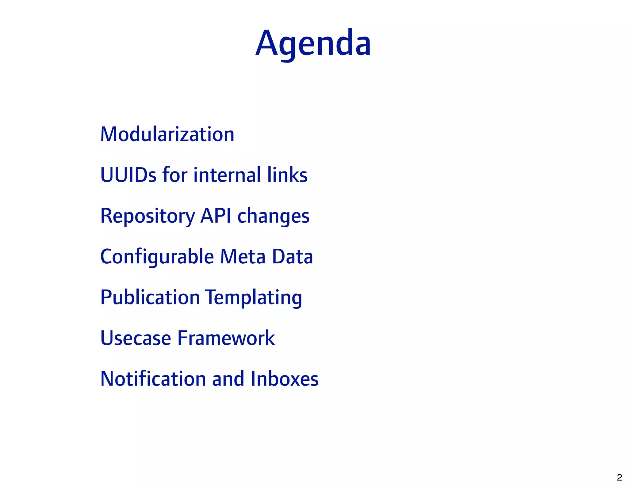 This document provides an overview of new features in Apache Lenya 1.4, including modularization, use of UUIDs for internal links, changes to the repository API, configurable meta data, publication templating, and the introduction of a usecase framework. Key points include improved separation of concerns through modularization, more efficient linking using UUIDs instead of URLs, a more queryable metadata model, inheritance and overriding of publication resources using templating, and a standardized way to declare interactive use cases in Lenya.