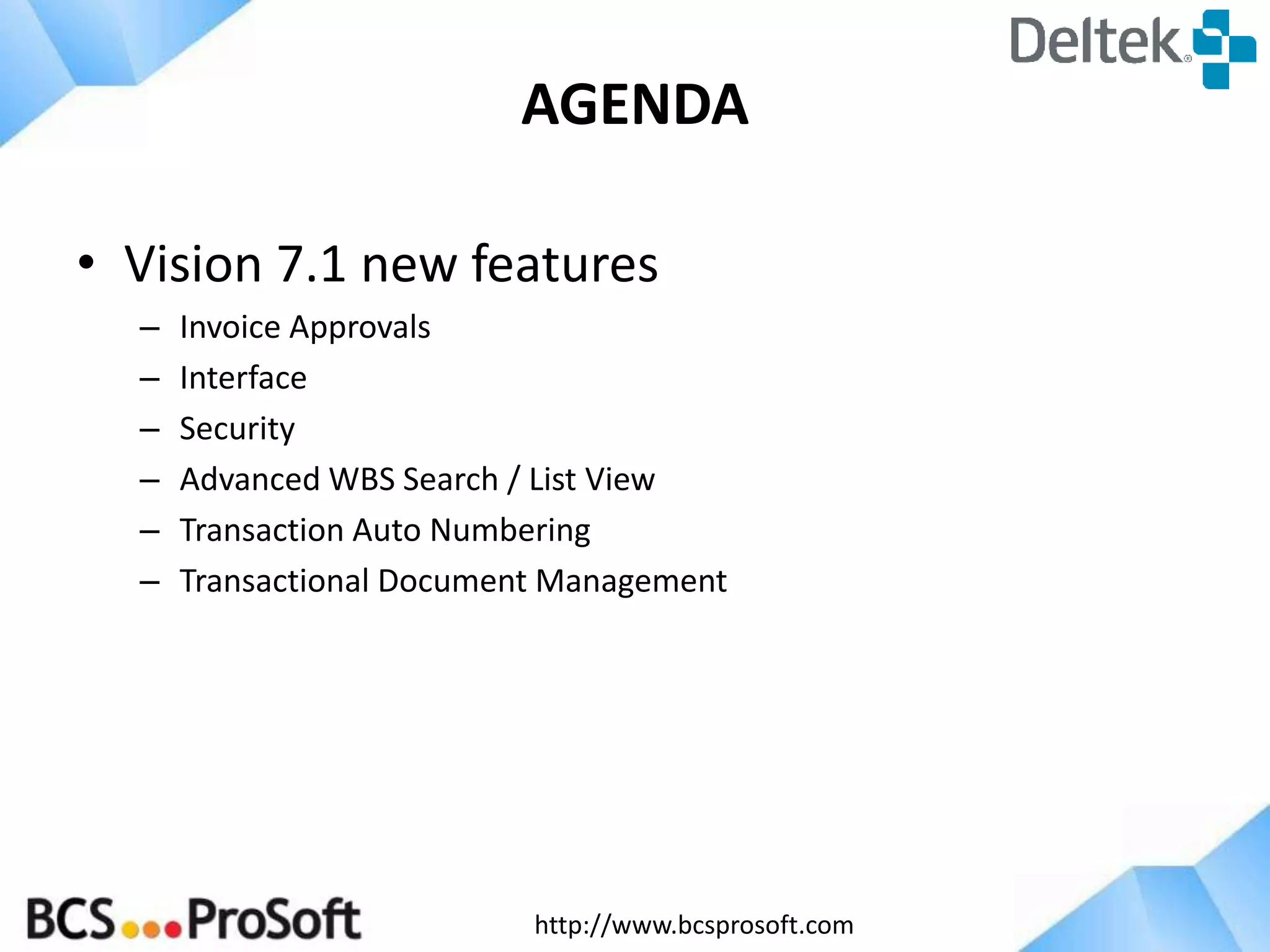 Vision 7.1, released on October 24, 2013, introduces new features including enhanced invoice approvals, security updates, and advanced Work Breakdown Structure (WBS) search capabilities. The invoice approval process is streamlined with notifications, electronic comments, and flexibility for project managers and billers to manage invoices effectively. Additionally, improvements such as transaction auto numbering and transactional document management are included, enabling users to attach documents to transactions for better organization and accessibility.