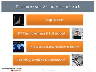 The document provides an overview of new features and improvements in Performance Vision version 2.18. Key updates include improved application definition and rules, protocol stack analysis showing layered protocols, support for Netflow v5 and Skinny protocols, enhanced HTTP analysis and filtering, and performance optimizations. Flexibility is increased through an enterprise licensing agreement allowing custom allocation of credits to licenses.