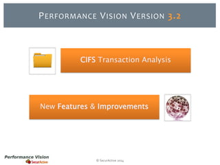 Version 3.2 of Performance Vision introduces new features for CIFS transaction analysis including performance monitoring, troubleshooting tools, and detailed metrics for clients, servers, files, and users. Enhancements include improved LDAP integration, better query multithreading for faster response times, and a new user-friendly interface for refined searches. Significant updates focus on improved data merging and the ability to switch between TCP flows and CIFS transactions seamlessly.