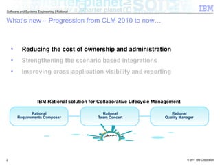The document outlines the enhancements in IBM's Rational Collaborative Lifecycle Management (CLM) 2011, focusing on cost reduction, simplified licensing, and improved integration across applications. Key improvements include role-based licensing systems, a unified administration interface, and enhanced visibility in reporting and traceability features. The document emphasizes better user management, flexible deployment options, and automated traceability enhancements to facilitate smoother workflows across diverse development roles.