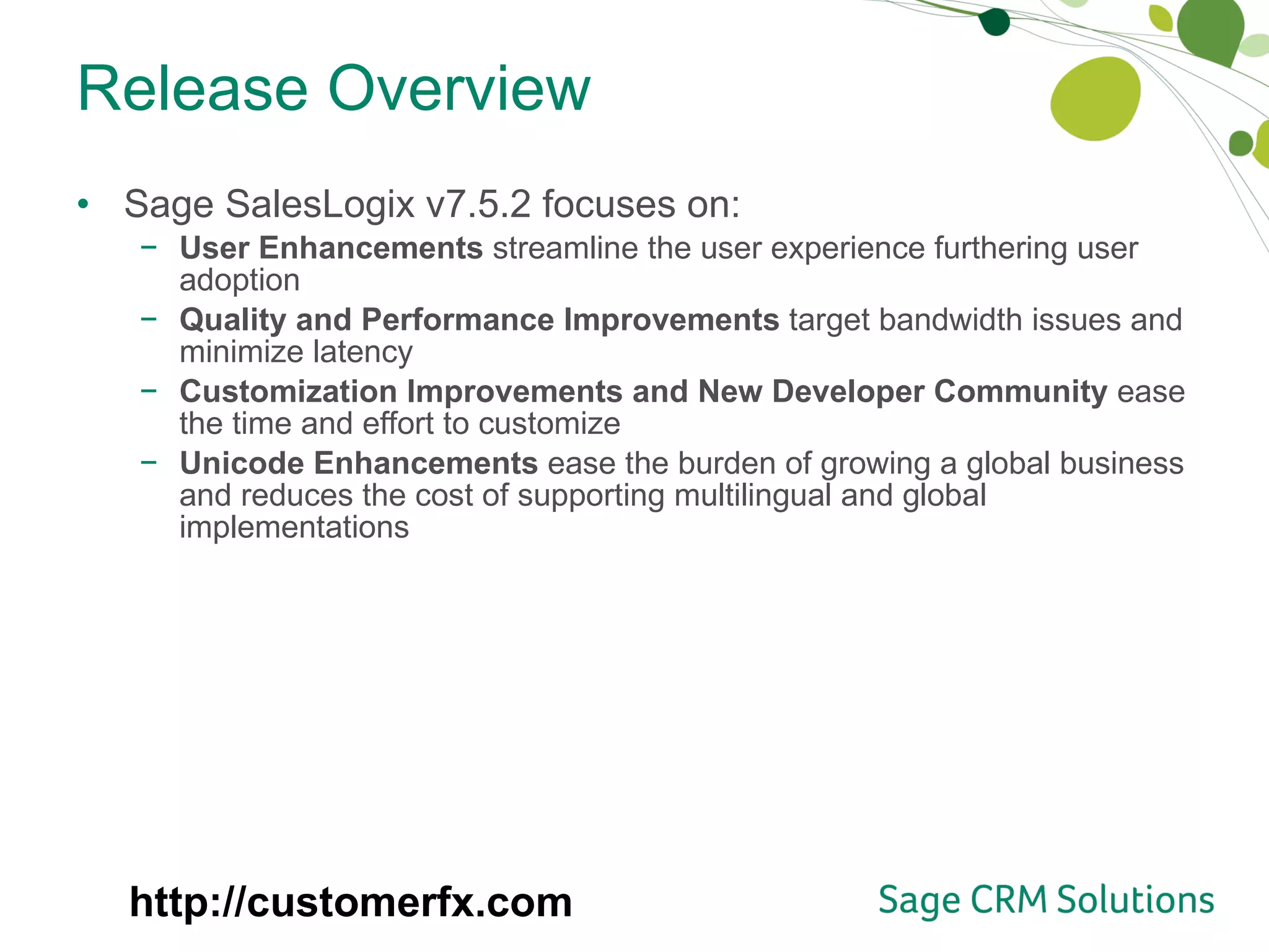 Sage SalesLogix v7.5.2 introduces user enhancements focused on improving the overall experience, quality, and performance. Key updates include customizable options, improved calendar and activity features, and support for multilingual implementations. The release also includes significant performance improvements in web client navigation and enhanced customization capabilities for developers.