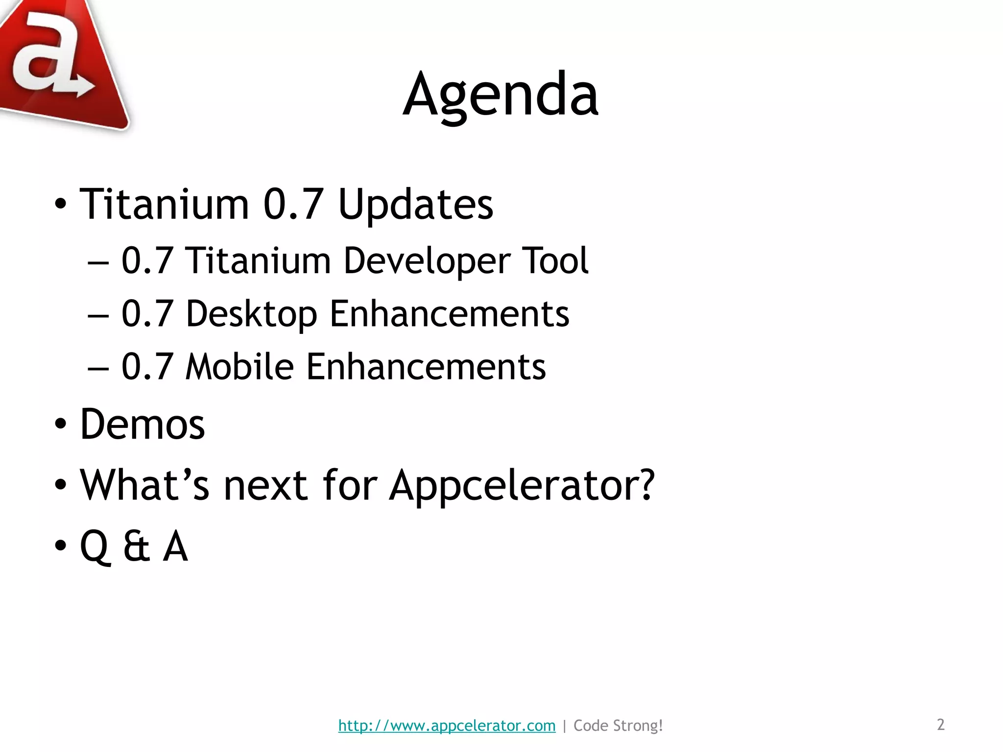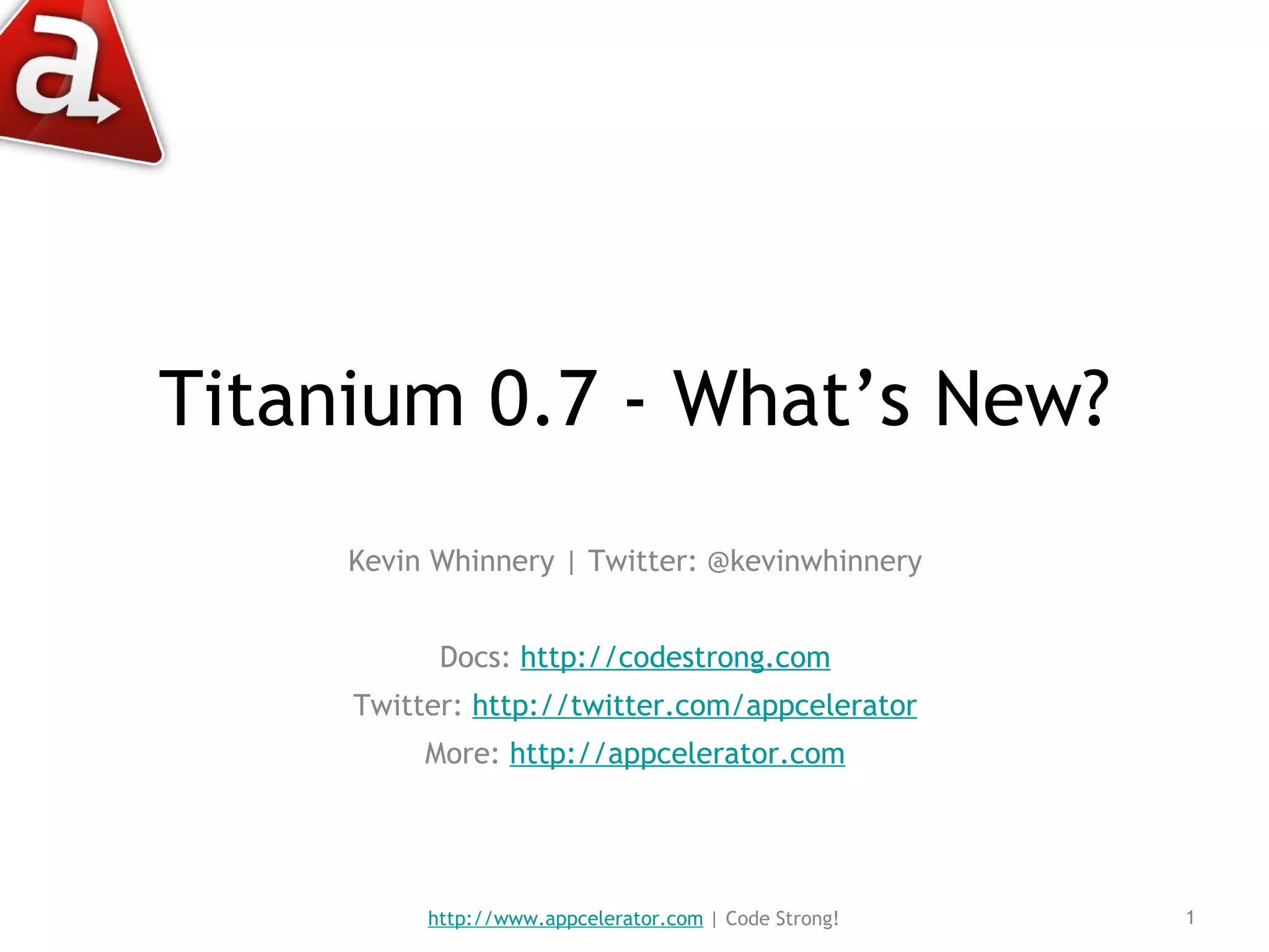 Titanium 0.7 provides several updates including improved logging, new native mobile controls like composite views and modal windows, PHP support for desktop applications, and social APIs. It also includes enhancements like performance improvements for table views, drag and drop capabilities, and new demos are provided to showcase the new features. Future plans include additional map integration and contact list functionality for mobile applications.