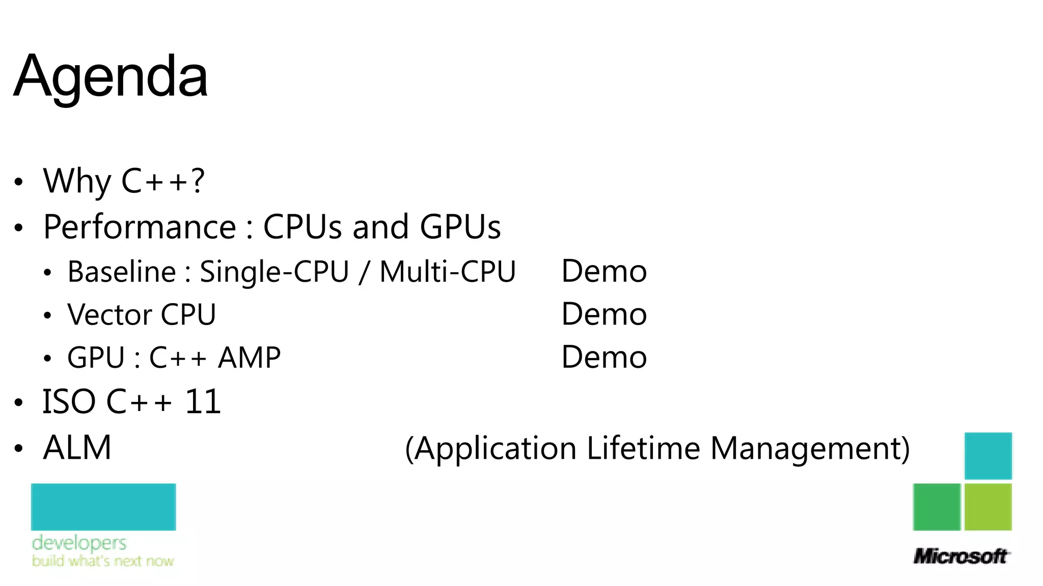 The document presents an overview of the advancements in Visual C++ 11, emphasizing the power and performance of C++ for modern computing, including both CPU and GPU optimizations. It covers key features, such as ISO C++ 11 enhancements, C++ AMP for heterogeneous computing, and improvements in auto-vectorization and parallelization. Additionally, it illustrates the potential performance benefits and high-level abstractions that C++ now offers developers through its integration with Visual Studio.