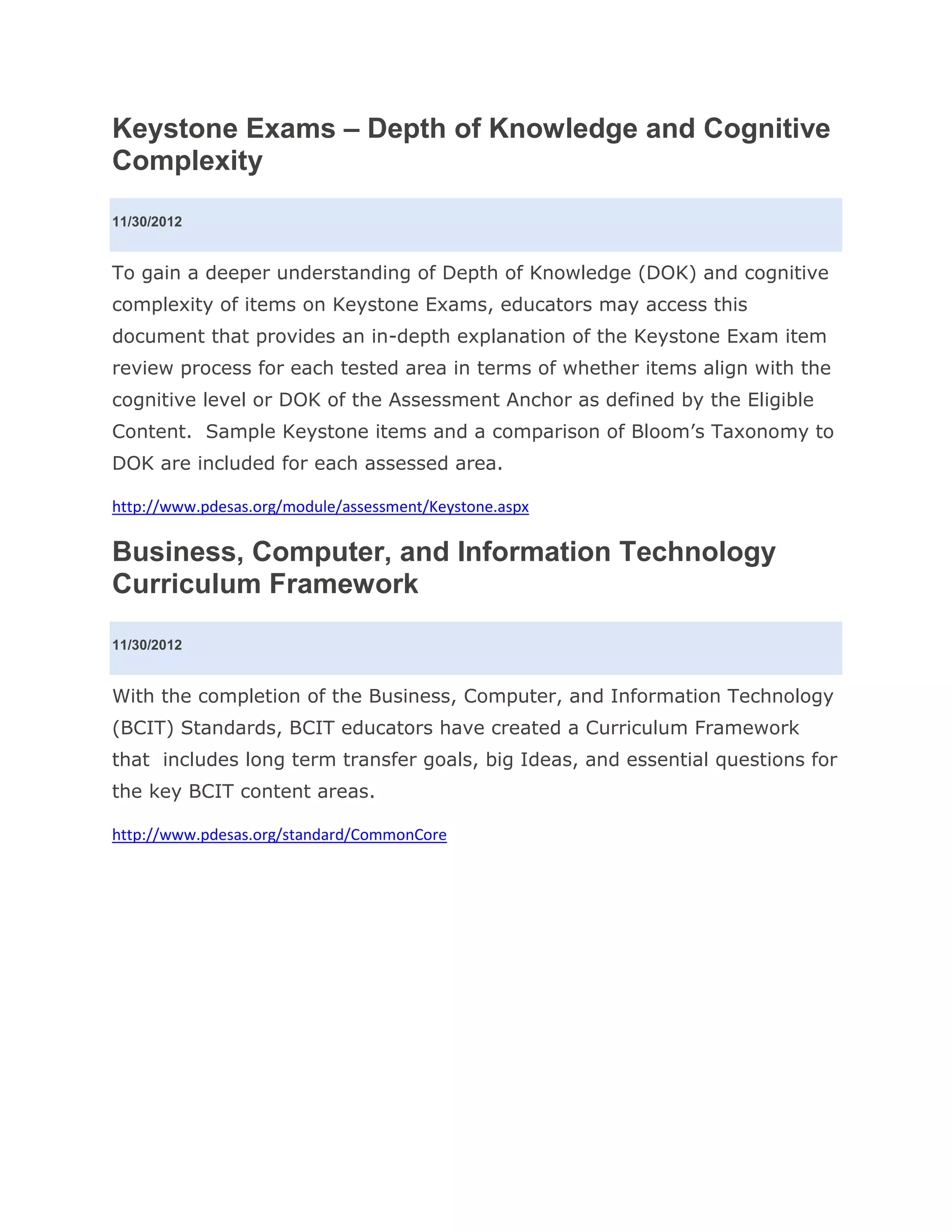 The document provides resources for educators to better understand the depth of knowledge and cognitive complexity of Keystone Exam items. It includes an explanation of how exam items are reviewed for their cognitive level and alignment with assessment standards, along with sample items and comparisons of Bloom's Taxonomy and depth of knowledge classifications for each subject area. It also shares a new curriculum framework created by business and technology educators that includes long-term goals, key ideas, and essential questions for those content areas.