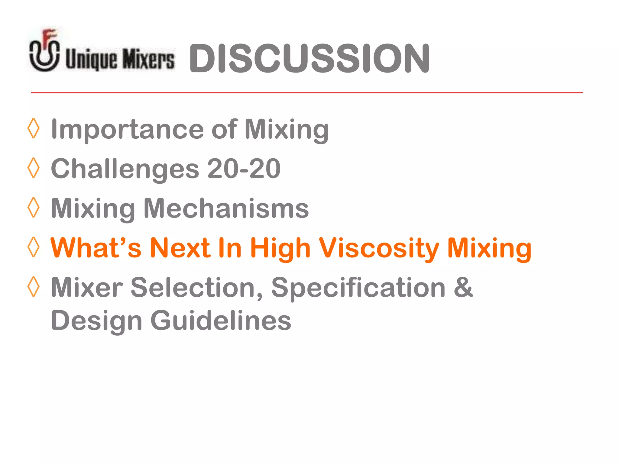 This document discusses mixing of high viscosity materials. It begins by defining mixing and its importance in producing consistent, homogenous mixtures. Mixing viscous materials presents challenges including heat transfer and requiring high mechanical energy. A variety of mixer types are presented that can handle viscous materials through different mixing mechanisms like shear and elongation. Selection of the proper high viscosity mixer requires considering material properties, process parameters, and testing through lab and pilot trials. Mixer design must provide thorough blending while preventing stagnation.