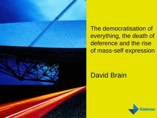 The document discusses the rise of mass self-expression and social media and how it has democratized media and changed consumer behavior. Key points: 1) Social media has given rise to citizen journalism and user-generated content. 2) Consumers now expect more dialogue and involvement with brands through personalized products and social networks. 3) Brands must recognize changing consumer needs and join conversations by developing original content, memorable experiences, and telling relevant stories.