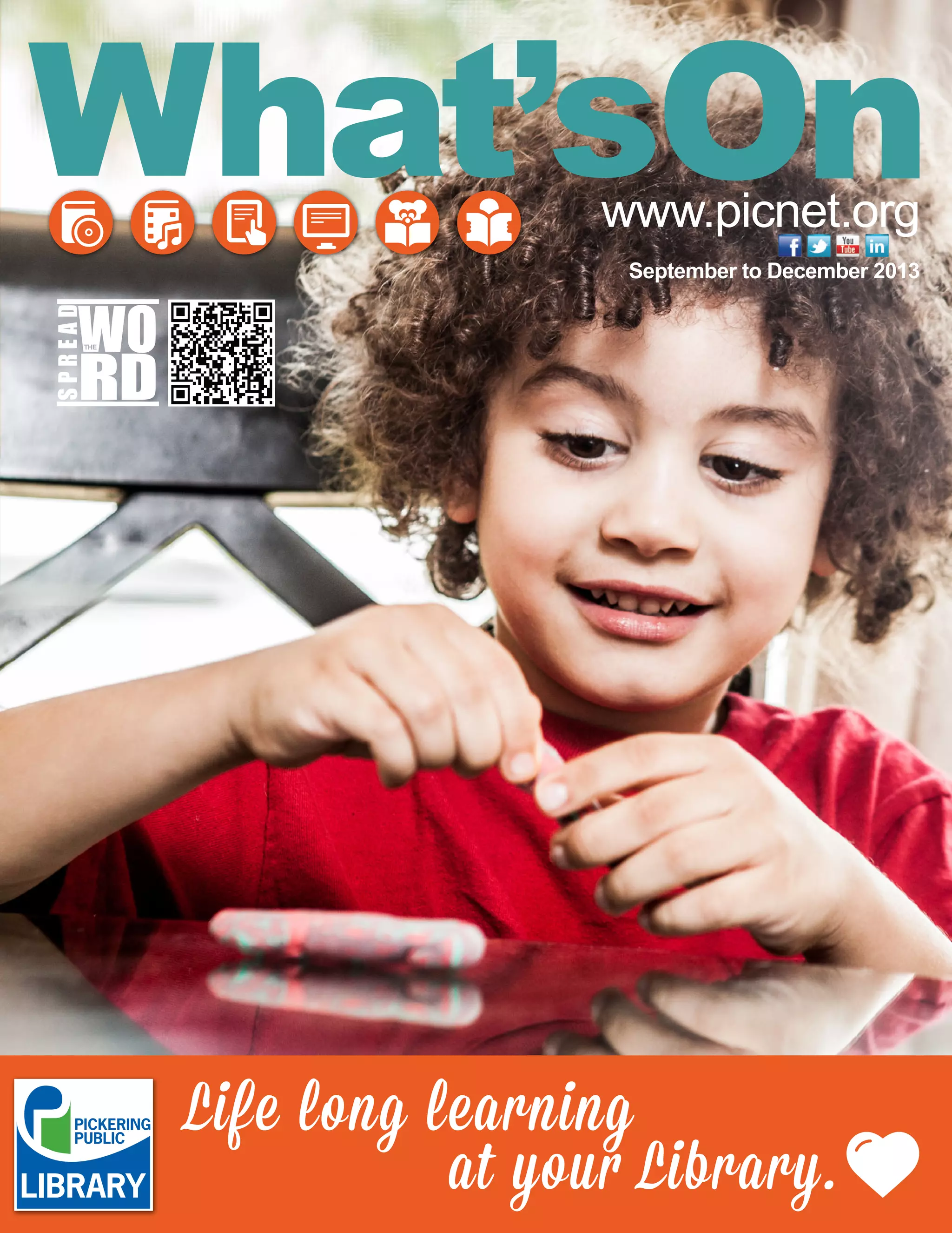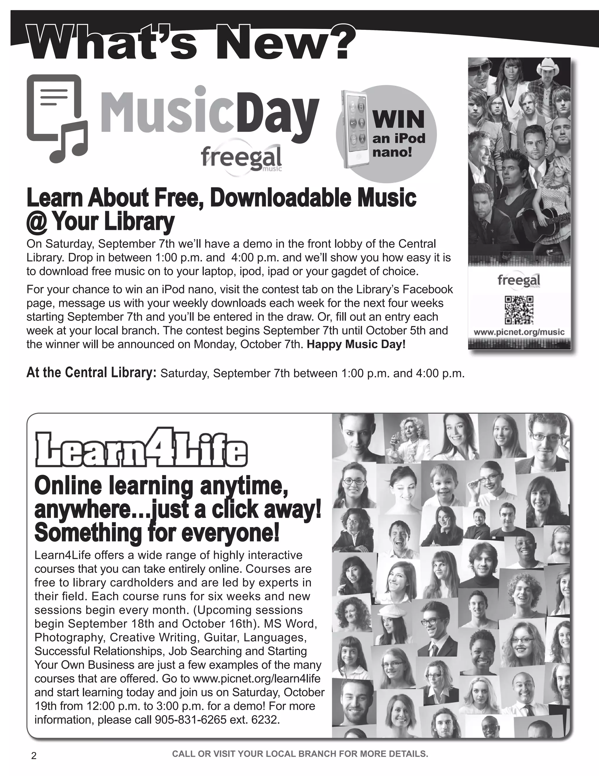 The document outlines various library activities and programs scheduled from September to December 2013, including music downloads, online learning courses, and storytime events for children. It also features contests, workshops, and social gatherings tailored for different age groups, alongside special holiday celebrations. Additionally, there are resources for adults focusing on resume writing and job searching, emphasizing community engagement through events.