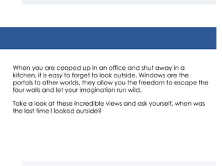 The document encourages readers to appreciate the views outside their windows while confined indoors. It features various stunning landscapes observed from different locations, including Hong Kong, Eastern Europe, and the Pyrenees. The imagery highlights the beauty of nature and urban settings that can inspire imagination and reflection.