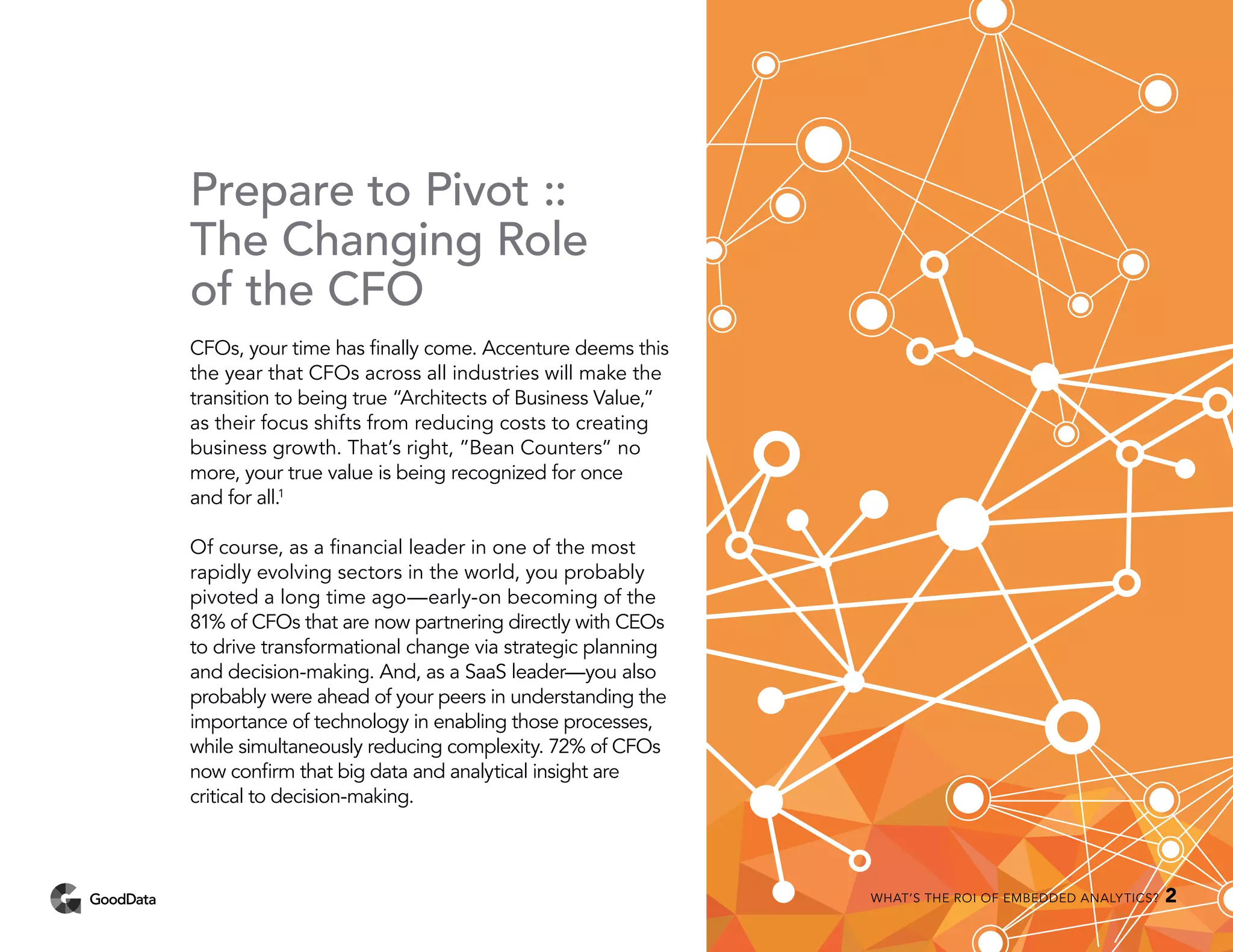 The document discusses the evolving role of CFOs as architects of business value, emphasizing the importance of embedded analytics in driving growth and decision-making. It highlights significant investment trends in data analytics and the competitive advantages of integrating analytics into SaaS products, which can lead to new revenue streams, increased customer retention, and reduced operational risk. Furthermore, the document outlines the benefits and market opportunities presented by embedded analytics, urging CFOs to embrace this technology for long-term success.